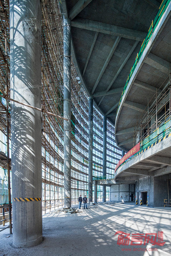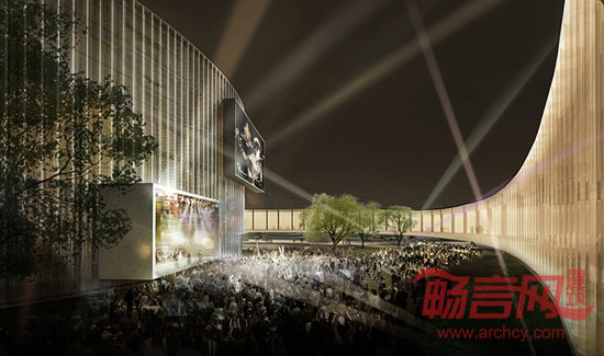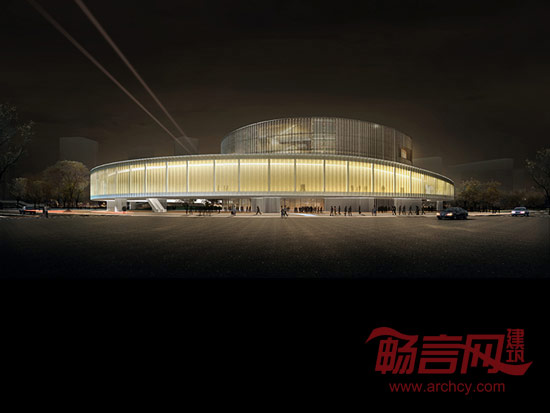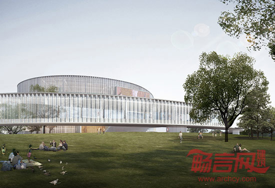 理念一条近500米长的架空环廊与主体剧院脱离,它将地标性质的大剧院从传统集中体量的模式转化为游离开放的模式。加强了“城市光环”主题的同时,使容纳了影院、餐饮、室外戏台的大剧院与周边的公园、街道、广场有机结合、相互渗透,将这些典型的城市元素混合成为一座“文化公园”。