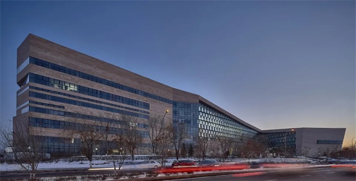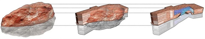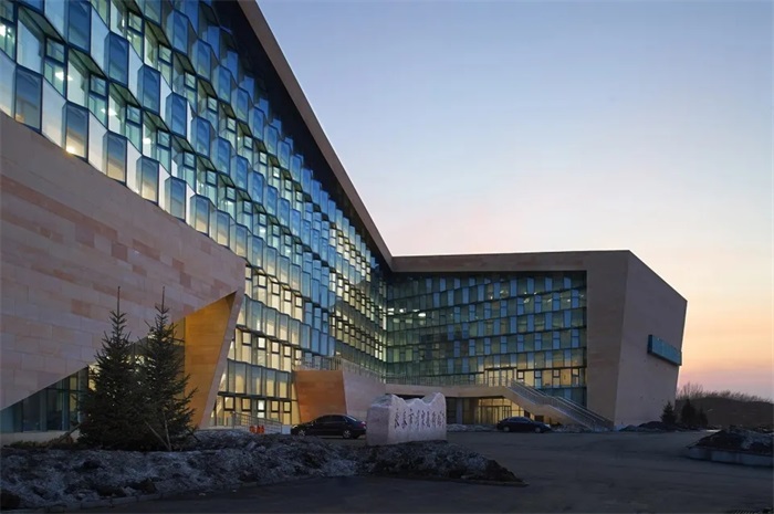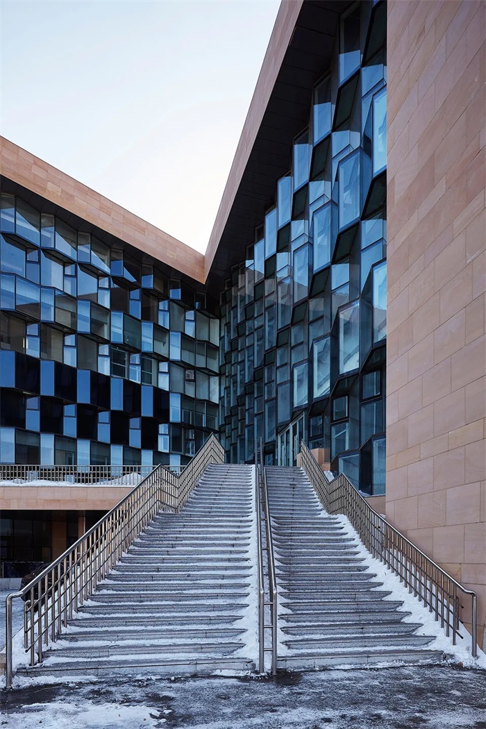整个建筑远看像是一个被抛入旷野的孤零零的石块,蜷缩在严寒的环境中,在冰雪的冲刷洗礼下成为屹立在整个环境中的原点。而这种“蜷缩”的想象同时暗示着内部的扩张——看似混沌的建筑形态从中间部分被剖开,“迸发”出晶莹灿烂的内核,犹如被打开的幸福宝藏。建筑和寒冷环境通过对抗而相互激活,热情纷繁的内核与粗犷原始的外表皮形成强烈的对比,共同传达出长春市群众艺术馆所应具有的那份厚重和热情。