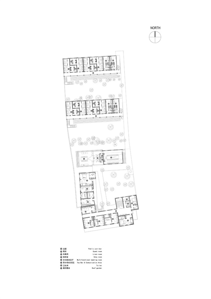 原本楼栋之间庭院留下的生长多年的大型水杉树别具韵味,但是原本的庭院空间不大不小没有被充分利用。而原本隔间式的宿舍户型将其改为客房后,空间局限性也很大。经过分析后,除了将内部户型结构重新进行设计与改造外,建筑师还决定将几个庭院也重新进行分配。1#庭院开放出来作为餐厅的延伸,形成休闲与就餐的公共庭院。2#与3#庭院则将其分割成公共活动的大庭院与客房专属的小庭院,增强空间的公共与专属使用价值的同时,也让水杉树与院落可以更好的相互交融。