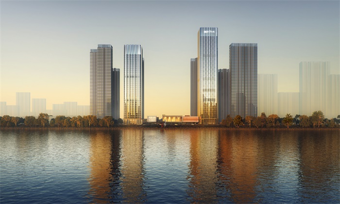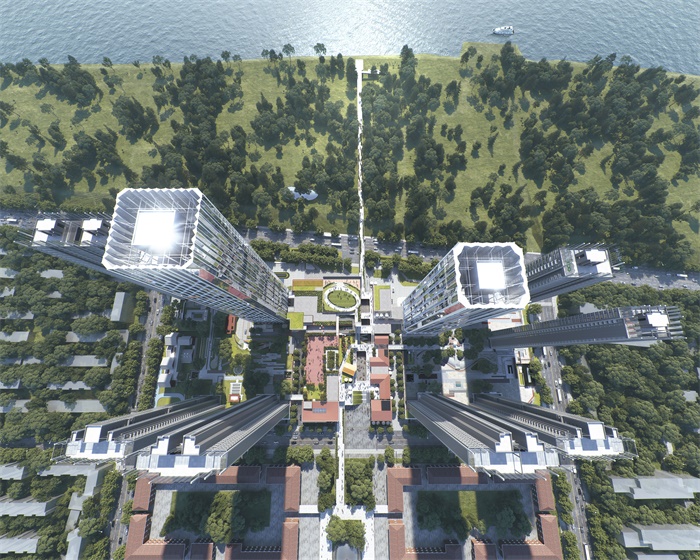 设计保留原城市设计的轴线结构,通过一条贯穿南北的中轴线连接临江和街坊两个高价值城市空间。住宅塔楼依次布局于中轴两侧,形成居住生活的东西两坊;奢华酒店和超甲级办公的商务塔楼沿江设置;而容纳会议中心、体育中心和商业街区的休闲商业空间位于中部,作为整个片区的衔接。设计通过体量错动及朝向调整,让各塔楼景观资源最大化,尽享江景、坊景、院景多维度景观。