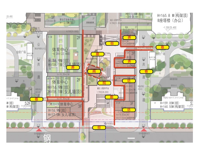 Aedas充分尊重原城市设计原则,在一链、一印、两章、两坊的全新格局下,以商业之章、塔楼之印,保留武钢囍印肌理,多维度传承武钢精神,将经典的大院社区空间引入当代商业生活方式。