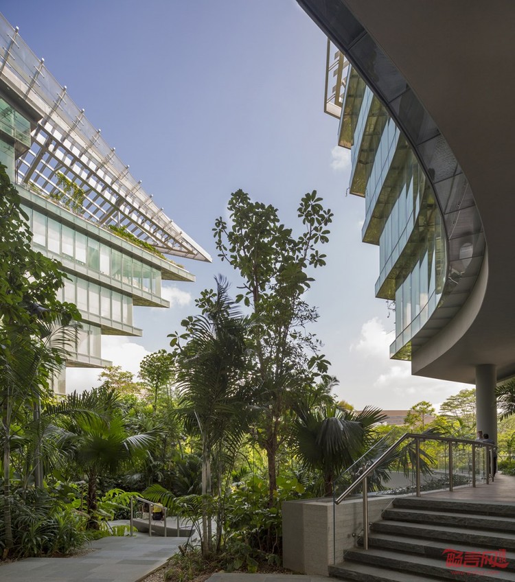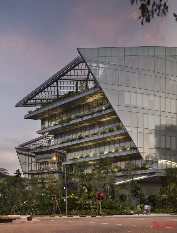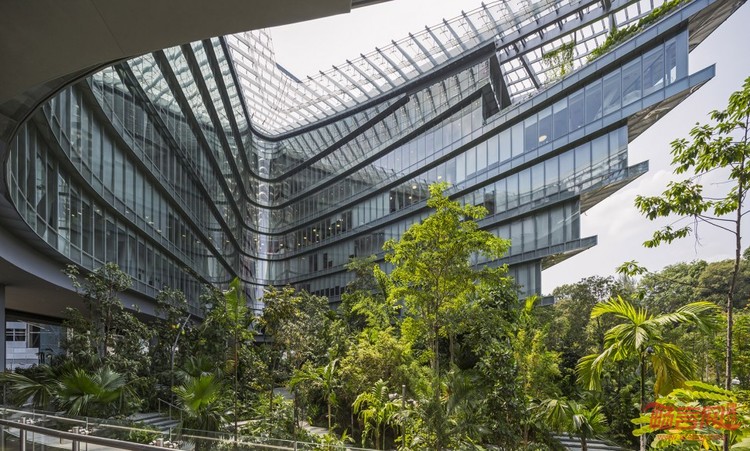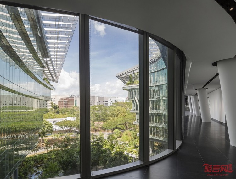 位于「马蹄铁」尾端的外悬平台绿意盎然,仿如瀑布般沿着大楼拾级而下,外立面采用了内部拥有金属涂料层的低铁隔热玻璃,而步行道均有遮蔽,如此种种都有效降低了太阳辐射所带来的热量。
