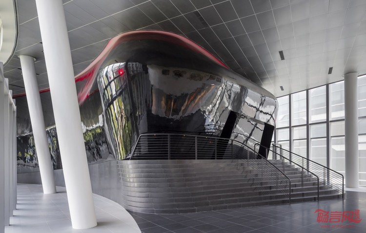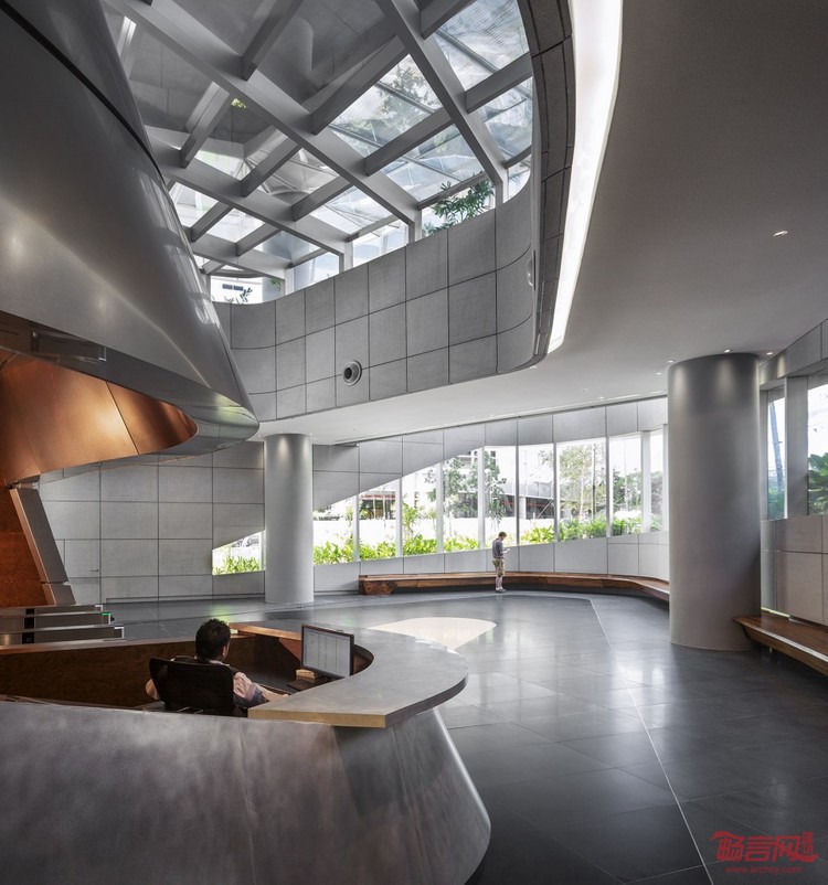 而在大楼内部,空间也被合理利用,并建造出一个波浪式外形的百人影院,为客户和其他大楼租户提供电影放映、舞台表演及其他活动的场地。该设施被安置在大楼高层的中央,用户区域较低的一端,也就是大楼租户的下方,方便大家使用。透过金属质感的外墙往内看,剧院显得若隐若现;而站在中央庭院时,这一设施则清晰地跃现眼前。这样的趣味也使大楼凸显与其他企业总部大楼的不同。