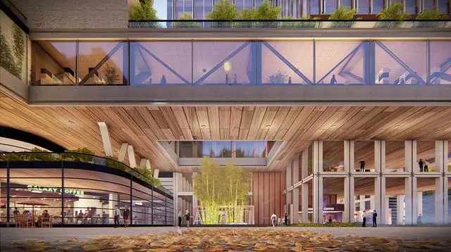 塔楼脚下仿照真实生态雨林打造都市绿谷,营造出“摩天楼中的生态雨林”之感,崎岖不平的天然岩壁,潺潺流水汇成瀑布,寂静而清澈的水潭,每一个元素都营造出诗意的休闲空间。