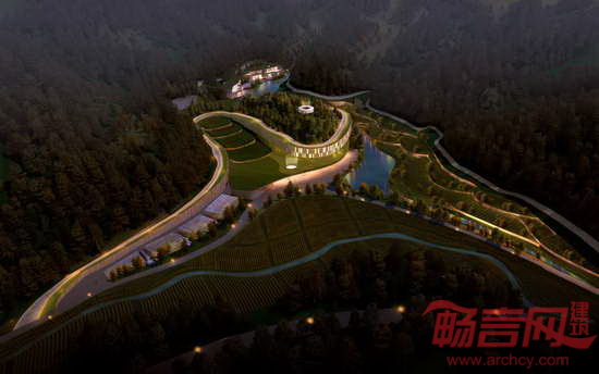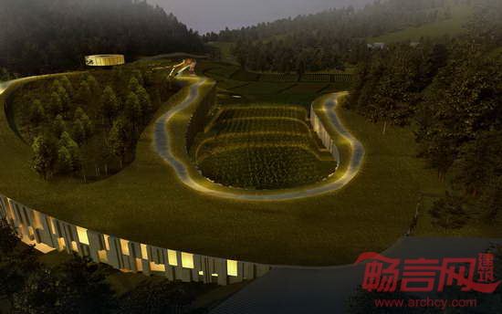 建筑设计发展的线迹完美的依照景观的地形走向,并创造了沿山腰蜿蜒的构成线。