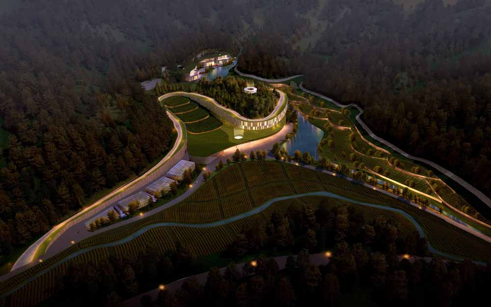 从地形和文脉开始分析,最重要的是尽可能的保持自然元素,强调出山体在溪谷自然构成中的中心地位。该项目的主要目标是将建筑对环境的影响降至最小,保持该区域的地质形态和农业特性,从地形角度延展建筑群落,并科学的组织发展该项目。