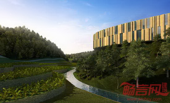 山顶上的全景观强调了在复杂地形中建筑群落的完整视觉感观;整个建筑设计主要强调了从城市和机场两个主要方向对形体的视觉感观。