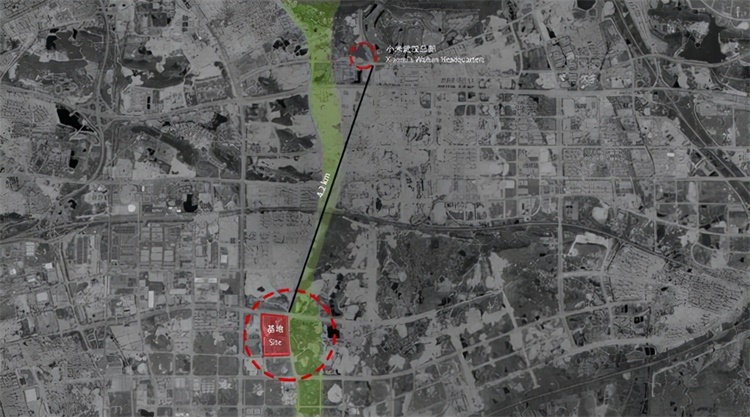 项目位于武汉光谷核心区,东面是城市级大公园景观,在大规模的办公产业园中,用构成元素打破整体变化单调且无明显特征性的总图布局,以增强园区趣性、增加园区特征点为目的进行标志性设计。将小米极简高效的特质溶于设计。以“点-面-体”的三维进阶,通过“聚合-链接-标识” 三部曲,将多种复合功能整合,通过水平,垂直交通达成高效互通。