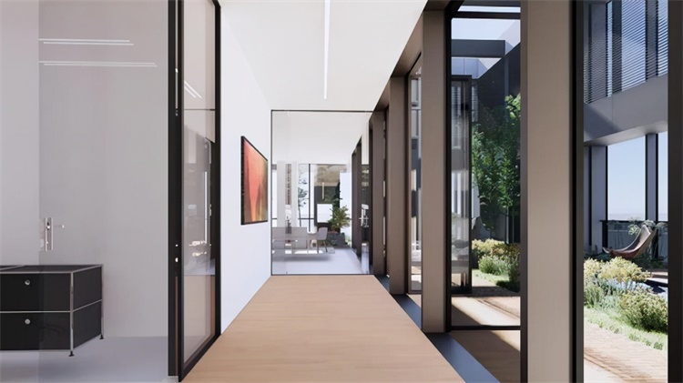 办公空间和电梯的分区设计相结合,实现了内部流线的分区到达控制。办公标准层层高4.50米。办公区宽度为21m。沿H型建筑外侧集中设置办工座位,中心区域为核心筒及卫生间等功能区以及包括会议、交流的共享区域。建筑顶层设有高管区,面向东侧可以观赏到豹子西公园以及面向南侧可以俯瞰整个樱花大道。