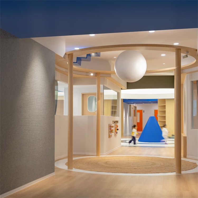 行走在空间中,伴随一种微妙的随机性,从漂浮在空中的圆球,到转角处的洞口,直线和弧线交错产生的空间感,构建着让人一眼看不透的空间关系,这些奇妙的感受让置身在其中的儿童产生联想和思考,诠释空间设计对于早期教育的意义——解放思维。