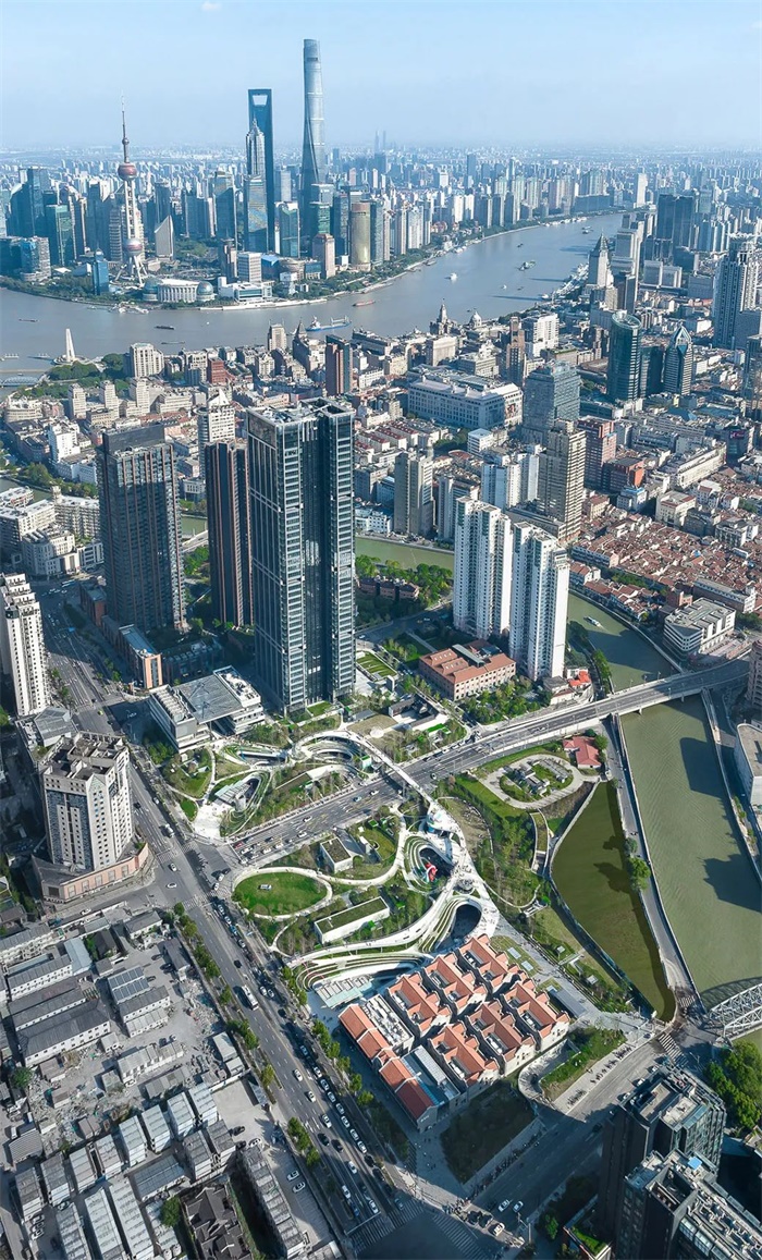 上海苏河湾万象天地坐落于约4.2万平方米的城市绿地中,按规划设计条件,地面建筑包含保护性修复历史里弄组群「慎余里」,上海历史上唯一一座官制的妈祖庙「天后宫」。由Foster+Partners设计的42层塔楼,是这一区域最高的地标,以及场地东北角新规划的四层门户建筑,二者共同限定了绿地东侧的边界。苏河湾地区的规划开发表明了当地政府计划缝合苏州河两岸,重振苏州河北岸地区的前瞻性眼光,而该区域作为上海过去、现在和未来的交汇点具有极重要的意义。连接苏州河水岸与腹地功能,丰富滨水地区功能复合度和土地集约价值,这也是Kokaistudios设计的切入点。