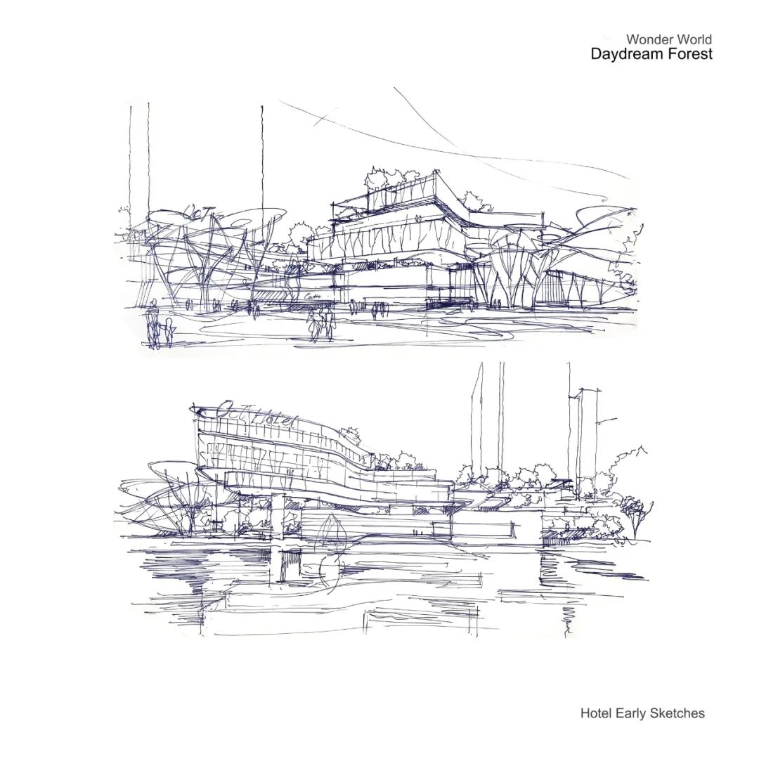 此外,团队利用酒店面向乐园一侧的水系,打造水上入园的独特方式,为访客提供难忘的出行体验。“我们希望通过建筑的设计和规划策略,实现综合体与乐园的复合交织,在不同尺度的戏剧性的碰撞叠加下,共同打造一座梦幻般绽放童心的沉浸式度假体验区,乐园与商业互哺,使彼此相互提升。”胡庆峰说道。