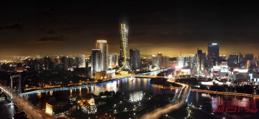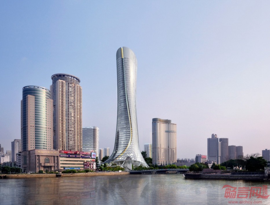 标志性建筑在空中轴线处向内收紧,斜柱支撑出的上部空间如同扬起的风帆,像在海上行驶的巨轮,勇敢、执着,引领宁波的经济文化飞速起航,走向新的未来时代。