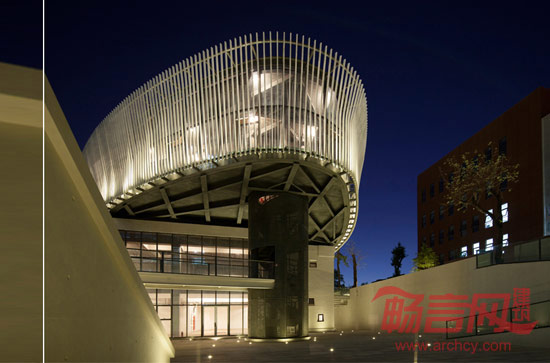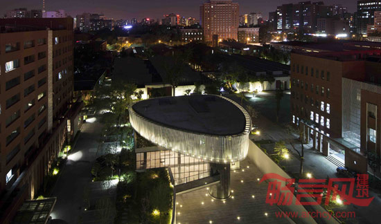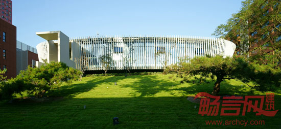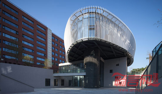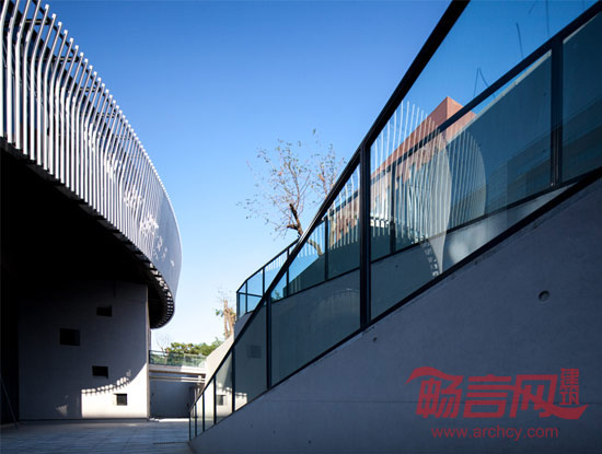 二层的钢结构透明玻璃体建筑设置了艺术创作沙龙及工作室,这里由钢结构建造的弧型玻璃建筑悬浮于基座之上,具有独特完整的雕塑感和标示性,这里由玻璃幕墙围合起来的空间可以环视俯瞰园区,由白色格栅组成轻盈剔透的表面肌理在阳光照射下光影生动,变化丰富,给人一种轻盈的、凌空飞跃的感觉,在周围比较死板的方形建筑群中形成一个视觉焦点,活跃了这个区域的空间格局和创意氛围。