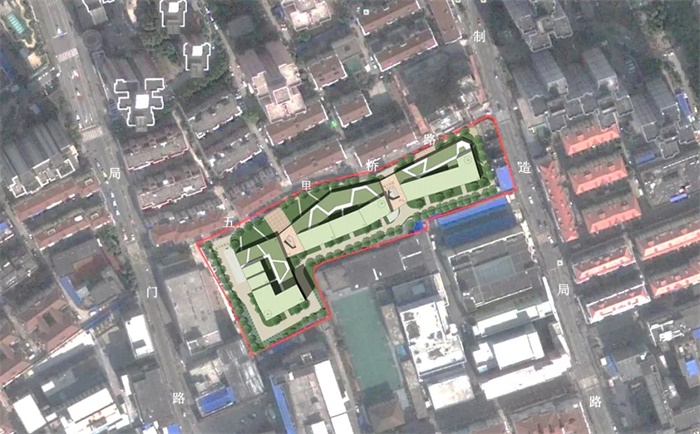 项目位于原卢湾区中心地带,制造局路与局门路之间,五里桥路以南,占地约1.2公顷,综合容积率2.6。北侧为老公房小区—丽园新村,住宅密集,与基地仅隔一条4.2米宽的五里桥路,给日照计算造成了很大难题。西侧沿局门路为厂房改造而来的创意园区—“智造局”。