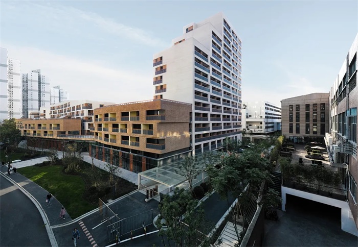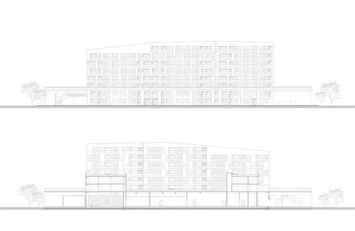 在沿街低层形体上又加以强化,并以分层错动的手法使过长的沿街面显得更为活泼且富有层次。底层临街则更为通透,与开放的功能相呼应。主体建筑立面采用素雅的暖灰色涂料,局部缀以鲜亮的色彩,宁静素雅中不失活泼,于周边建筑群中低调内敛而不失个性。