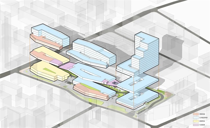 东端建筑紧邻制造局路,人流量较大,公共性强,底层布置经营型办公及自用型办公的大堂与会议中心部分,充分利用地段价值。中部建筑底层北侧设置区公租房管理中心及应急中心,并配置入口停车广场,方便工程车辆停放;南侧为住宅。
