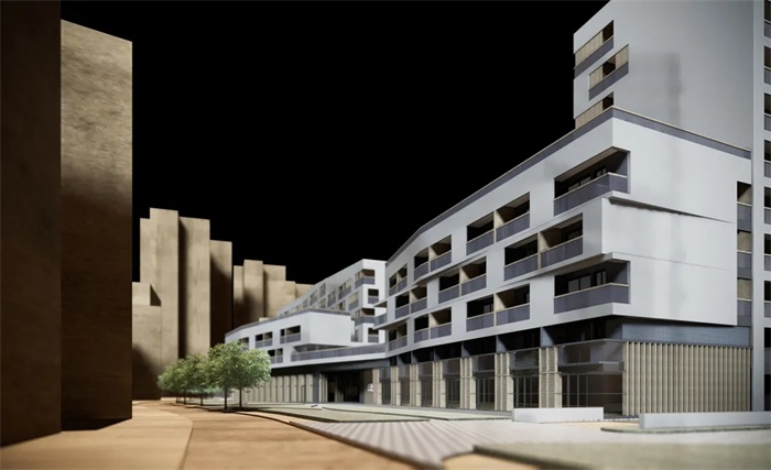 设计将公建置于每幢建筑的底层沿路位置,既减少临路受干扰的住宅,又充分利用较有价值的公共区域,同时有利于近人尺度的沿街气氛营造。通过建筑间的灰空间解决不同功能的公建及公寓社区的出入口交通问题。