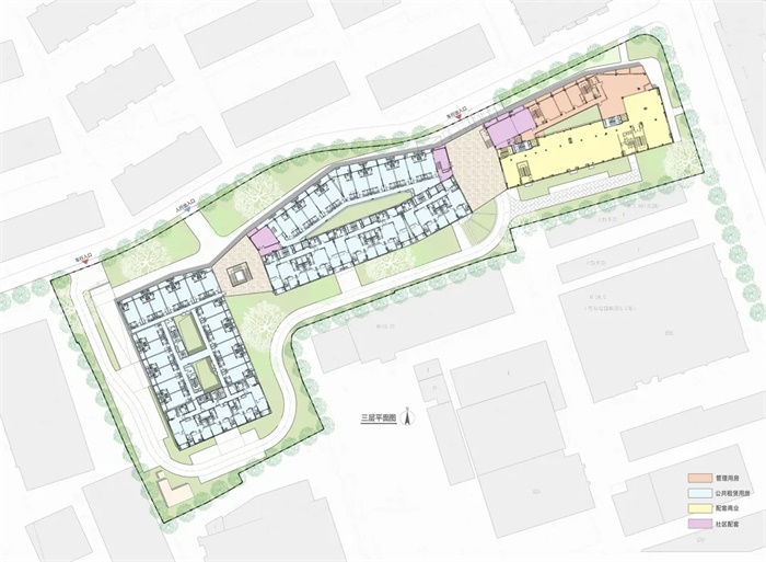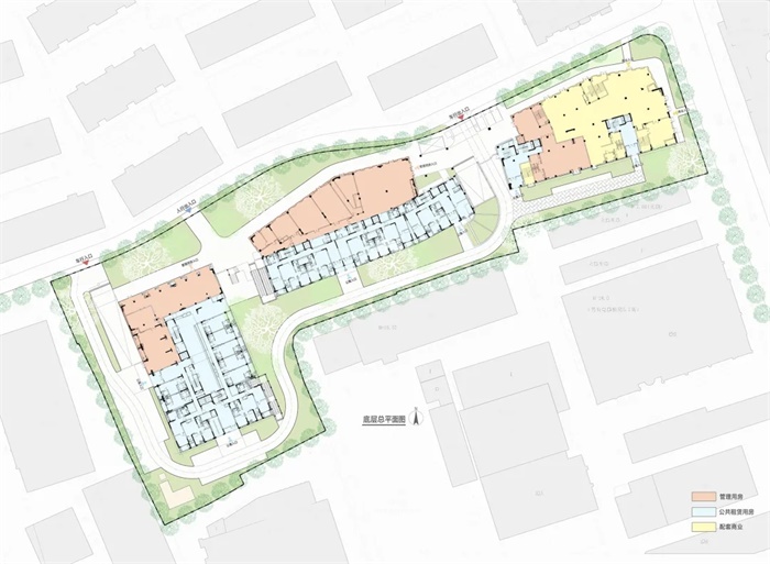 西端建筑底层临路及东北向无日照区布置经营型办公及公租房的物业居委等行政设施,其余为住宅。上部住宅均在各号房底层设有配置信报间的单元门厅,位于南侧不临路的区域,与公建区流线互不干扰。