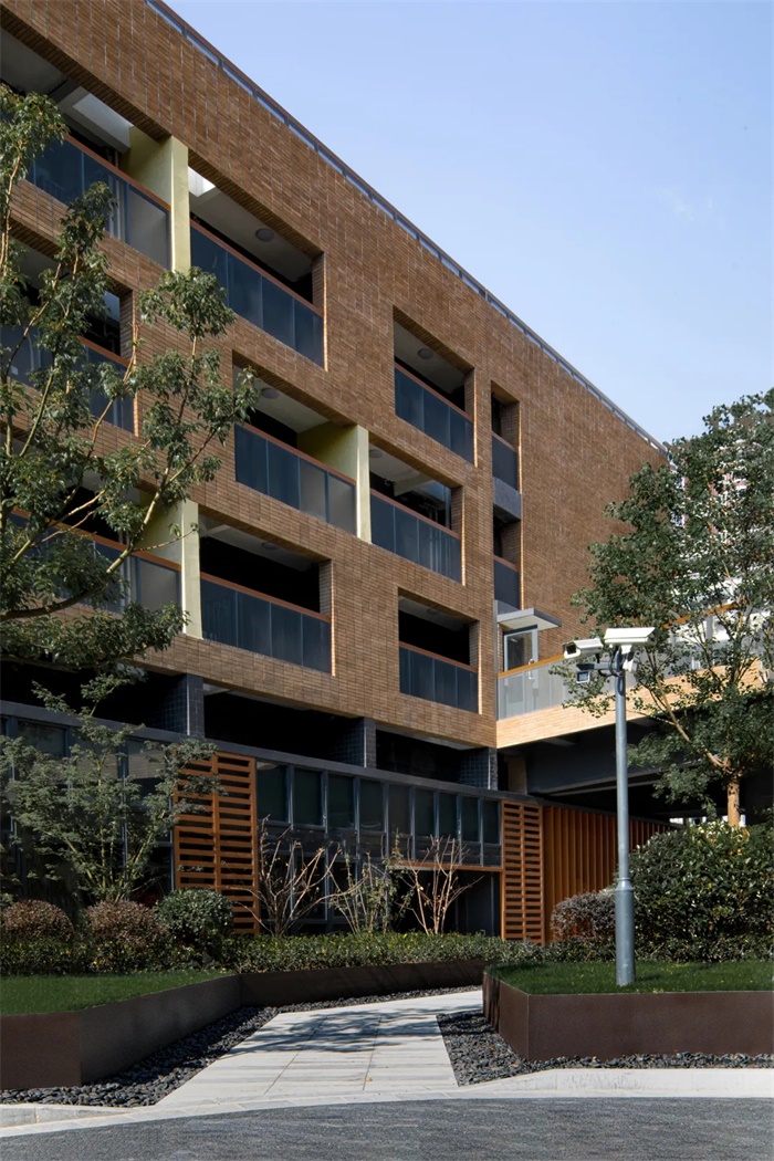 沿街裙房则呼应西南侧的办公楼,使用了褐色仿古面砖与亮色涂料的对比,使原本灰暗的街道增添了不少年轻的活力。底层木纹线条的使用更多了一些温馨的色彩。材料的选用方面,拉毛的涂料、哑光的小面砖、古朴的劈开砖加上局部木纹铝板的点缀,在很有限的预算内达到了性格鲜明而又优雅温暖的视觉感受。