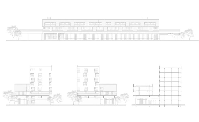项目以谦逊的态度扮演了这个新来的角色,在各个外部界面都与邻近的建筑构成一种和谐的对话关系。周边体量最大的新村住宅构成了老五里桥路的城市界面。我们提取了原始住宅的立面构成关系,略加变化,构建了项目主体立面构成逻辑以及统一的建筑语汇。