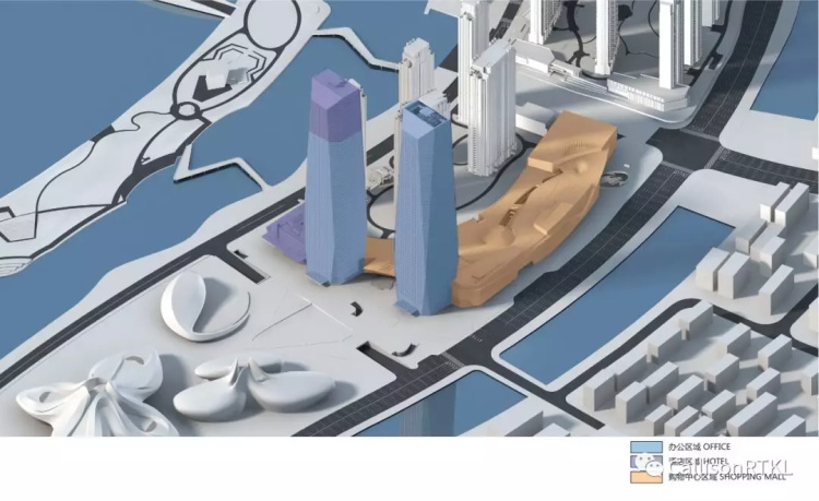 项目整体规划与文化艺术中心息息相关,两栋238米超高层塔楼矗立在艺术中心西侧,北塔为纯写字楼,南塔是上部为喜达屋豪华精选酒店的客房,下部为办公,底层是酒店大堂,成为裙房的一部分。双塔与文化艺术中心形成一个整体,西临城市高架路,文化加商务的功能共同形成符号化的城市形象界面。塔楼逻辑严谨的硬线条形象和强烈秩序感的室内空间,与灵动轻盈的白色文化艺术中心,形成了一个戏剧性的对话关系。通过地面人行流线融合,以及地下车流下穿隧道连接,两个地块产生集群效应,进一步形成和谐的城市关系和社区融合感。