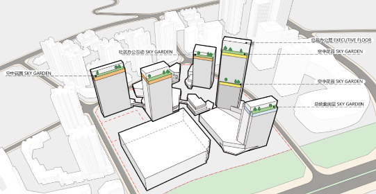 设计利用场地高差,以连廊将酒店、办公、商业三个功能区域有机穿插咬合。街区式商业贯穿地块南北,迎接各方而来的人流;五星级酒店前置,毗邻金洲大道形成良好的城市界面;公寓内置远离街道喧嚣;集团总部及办公楼沿干道而设,通过调整塔楼朝向,将建筑展示面最大化,顺势营造出东北角最佳的入口空间。