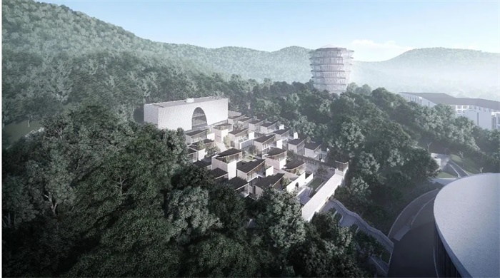 东侧较平整区域适合建设较大体量的公共建筑,如佛教文化中心及多功能综合体;山谷可建设对外较为隔绝的禅修中心;场地制高点可结合地形建设高塔。