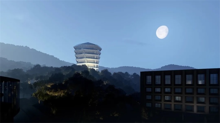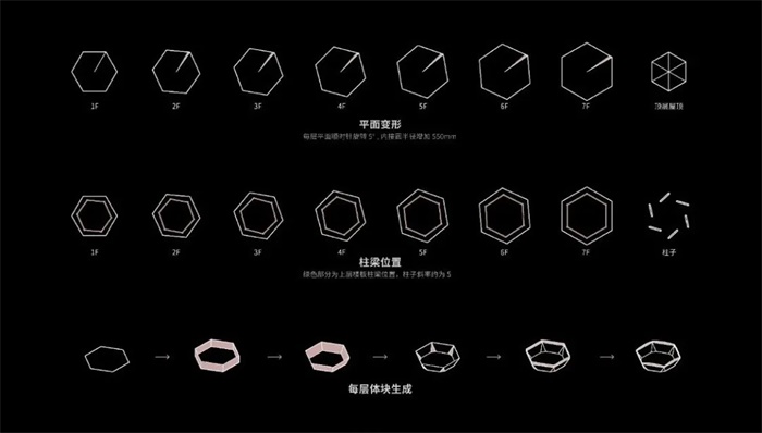 通过不断叠加具有稳定性的六边形,每个叠加的六边形都平面顺时针旋转相同的角度,并逐渐增加内接圆半径,最终得到如莲花绽放般建筑外观形态,用现代手法营造出了对禅意的表达。
