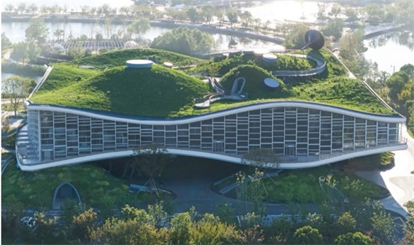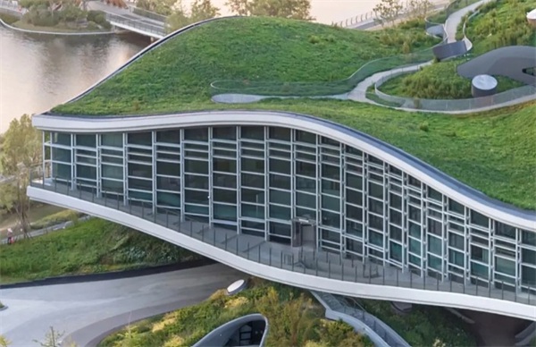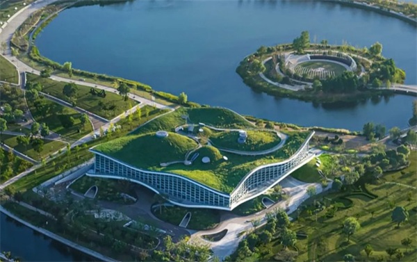 在上海五座新城的规划中,奉贤的金海湖是新城的核心景观。“在水一方”的基地近乎正方形,位于湖东的环形半岛上,东西两侧临水,是一座以科幻为主题的多功能文化地标。设计的走向源自选址和功能定位:建筑在景观空间上与环湖绿带取得协调的同时,也需要在内部体验和外部形象上建立自身的独特性。