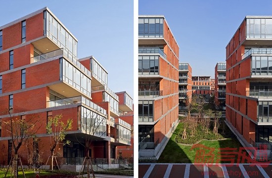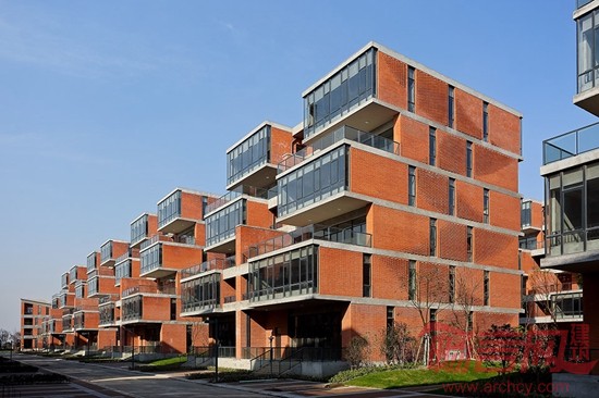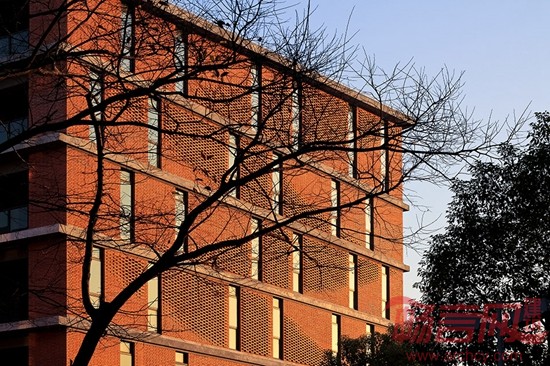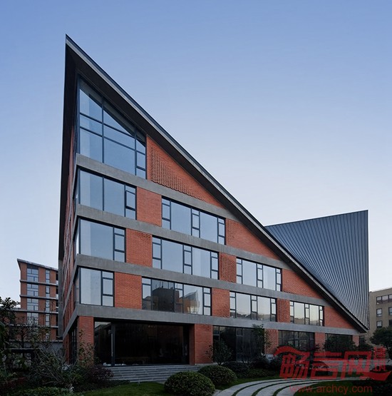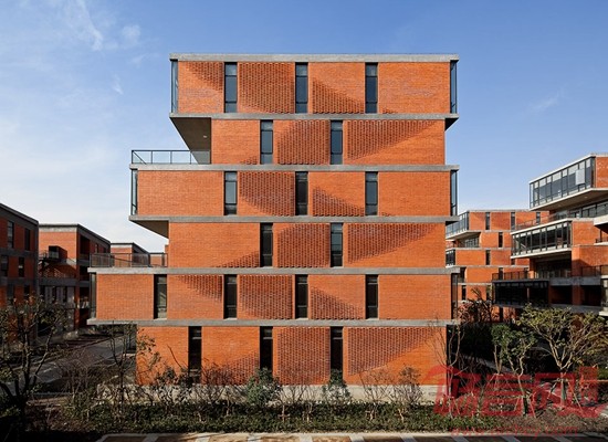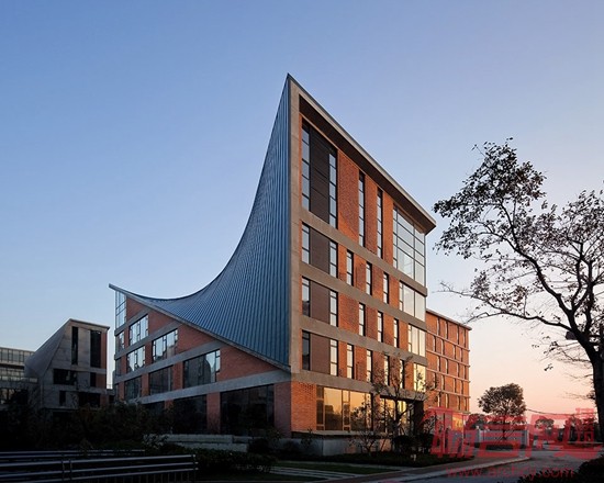 在单体建造方面,我们重点考虑的是降低成本材料及如何与数字化设计相结合。因此我们在设计中采用了直白的几何逻辑理性,通过简洁的构造方式,实现了传统材料的当代价值。通过对梁、柱、板等基本建筑元素的细节化处理,让结构直接呈现出建筑的本真之美。红色页岩砖、玻璃和混凝土等材料彼此真实反映了建造关系,营造出了一种朴素和简洁的整体性氛围。通过数字化设计手段重新使得传统的红砖砌筑焕发出新的魅力,传统的“丁-顺”砌法通过非线性的逻辑而加以重构,简单的定位与控制方式让工人通过简单的学习就可以加以营造,这也进一步控制了项目成本。入口会所屋顶利用有力的几何逻辑创造出了独特的空间景观效果,屋顶朝着人们接近园区的方向扭转与翘曲,反宇向阳,随着不同的观察位置,屋顶的翘曲与天空的关系也不断变化,同时直纹曲面的几何关系也使得钛锌板的铺设实现了精确的操作。
