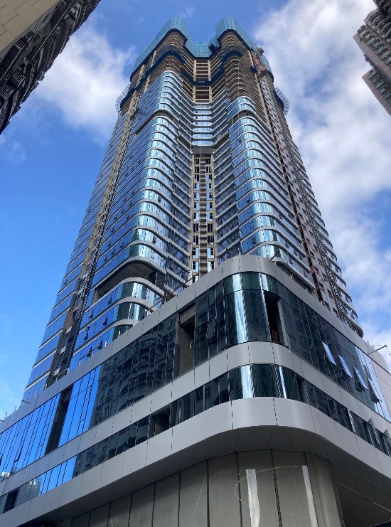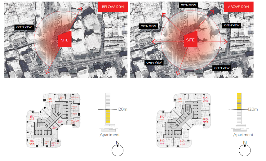 “我们希望通过设计回应并融入周边的城市肌理,并为使用者营造出最大的景观视野。由于地块南侧与东侧存在已建成建筑,我们调整了塔楼布局方向,尽可能为使用者提供全景视野。”Aedas执行董事柳景康(Cary Lau)如是说。塔楼高198米,旋转塔楼朝向后,设计结合地块环境,将更具商业价值的大型单元设置于无敌视野的高层,中型单元设置于120米以下的区域,可通过转角窗尽享无遮挡的视野景观,小型单元的景观视野亦得到了改善提升。