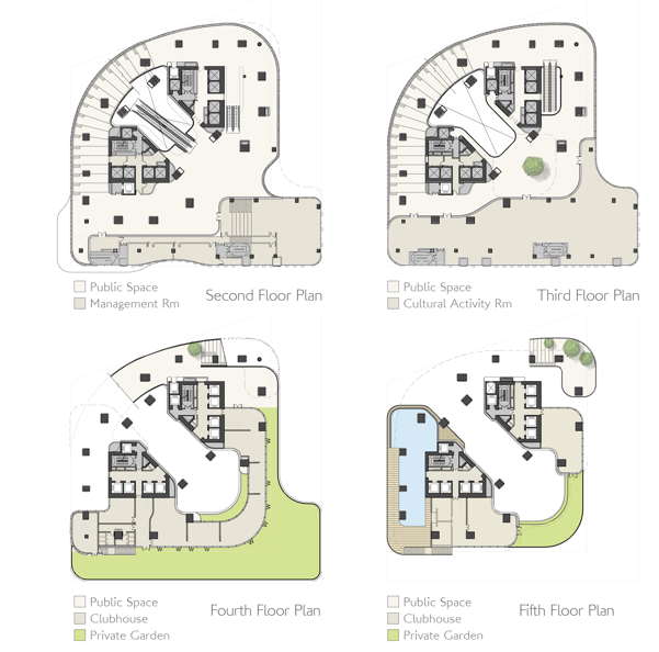 设计的一大亮点是底部横跨三层、总面积约6,600平方米的螺旋布局公共空间,其中阳光充足的中庭将成为社区的活动空间、社交中心以及文化中心。此外,四层及五层还设有包含游泳池、体育设施以及私人花园的多元化功能房,为访客提供丰富的休闲体验。