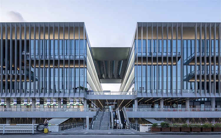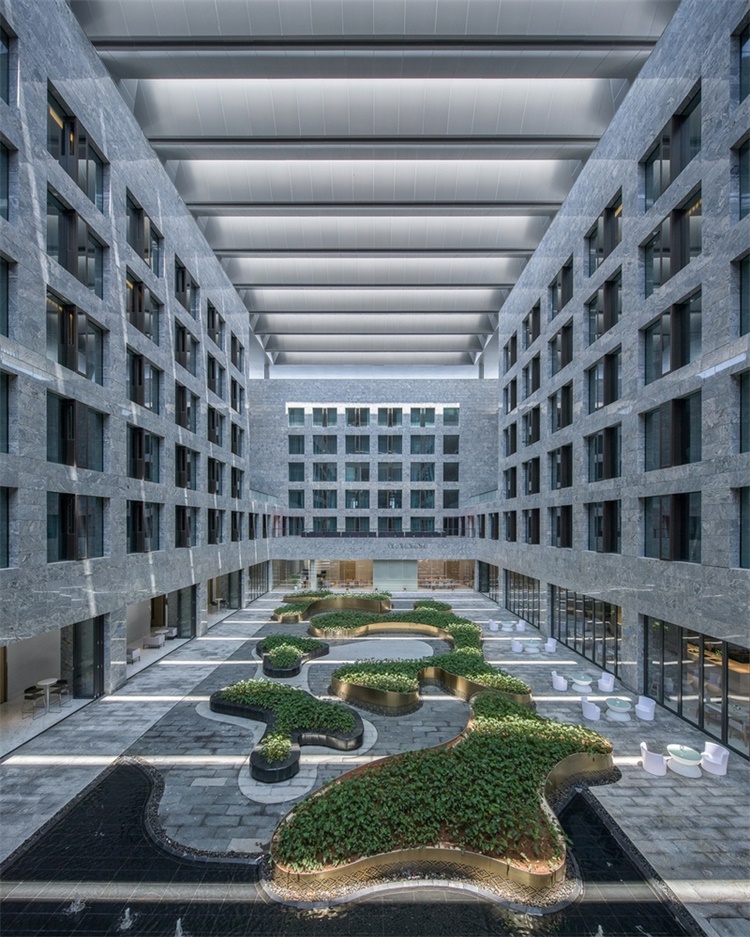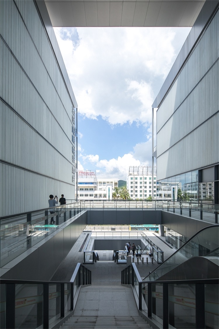 在城市和建筑之间建立起一系列空间层次是境工作室面对大规模粗放建设并试图恢复传统城市细腻丰富的体验性的常用策略。从三层公共平台引入,穿过骑楼、架空层,逐渐远离喧嚣的城市背景,到达入口大厅,拾步进入绿树摇曳的内院,经由扶梯、楼梯等慢速交通,引导到各个标高的空中平台和屋顶花园。