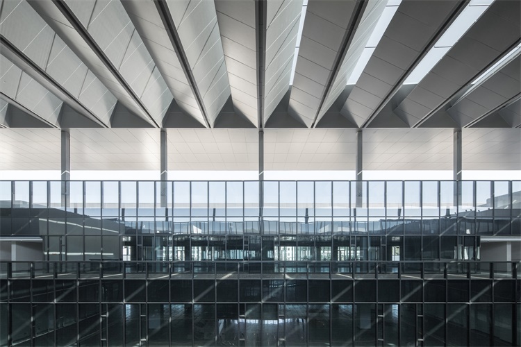 在东西方向上,为了保持各功能体量以及中庭内外在视觉上的贯通性,中间三跨采用的是无柱大空间,集中布置门厅、多功能会议室以及开放休息区等公共活动空间。