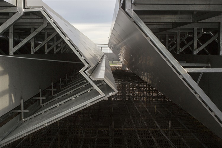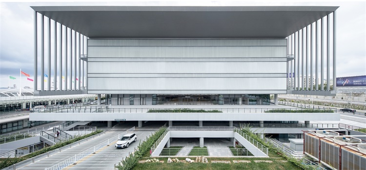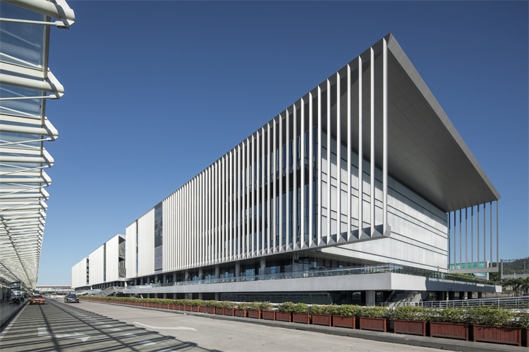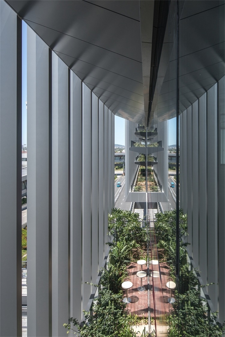 在建筑的南北立面上,采用的是双层表皮的设计。外侧为竖向金属格栅,内侧为玻璃幕墙。双层表皮的设计有利于在建筑与城市之间形成一个柔和的过渡。既能屏蔽部分噪音,营造室内对景,又能抵挡日晒,创造一处凉爽舒适的阴影空间。