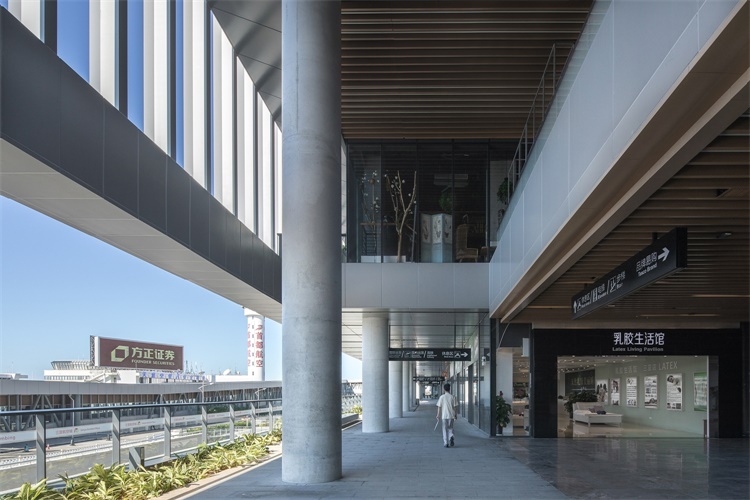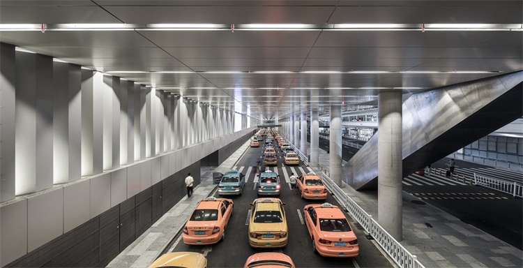 举在空中的新的地面层东西向贯通延伸,承托免税商场、办公、商业及酒店等多种功能体。不同功能体之间留出宽阔的通道,利于引导人群在城市和机场航站楼之间流动。同时,通过合理组织不同标高的人行路线,机场停车楼综合体能够将毗邻的高铁站、城市公交车站以及机场航站楼无缝连接起来。
