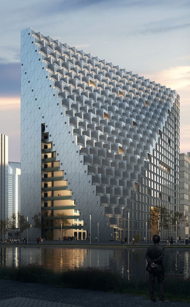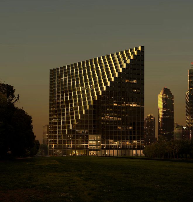 新湖中心总建筑面积为50000平方米,OMA通过对建筑基本轮廓进行大胆的斜切处理,为其创造出独特的形体,并形成拥有丰富景观视野的梯田状LOFT单元。建筑内部塑造了一个对外开放的中庭花园,设有水景和活动场地。