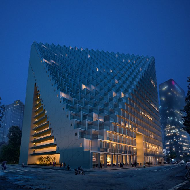 金字塔造型的综合体建筑内设有一系列功能内容及空间,包括酒店、商业、多功能LOFT以及中庭花园等。而相邻是一座总面积为35000平方米的住宅塔楼,其外立面设计与杭州光棱的几何线条相呼应,两座建筑相辅相成。