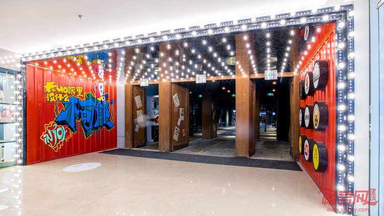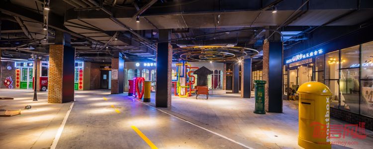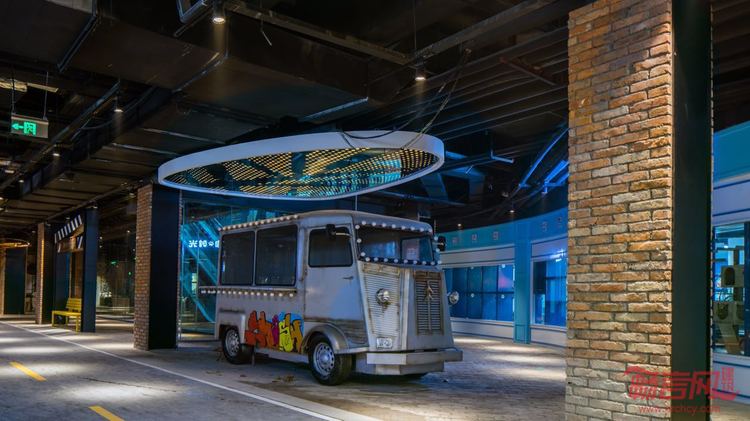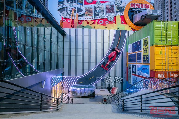 墙面上的立体F1赛道,流动的灯光,充满动感,一辆赛车宛若从天而降,驶入地下主题商街。F1赛车仪表盘主题墙,喷涂的标识与旗帜,拱桥上的Q版车模,方向盘造型阶梯扶手,方形混色铺砖与各色车牌的组合,渲染出可传递的赛场上的欢乐氛围。