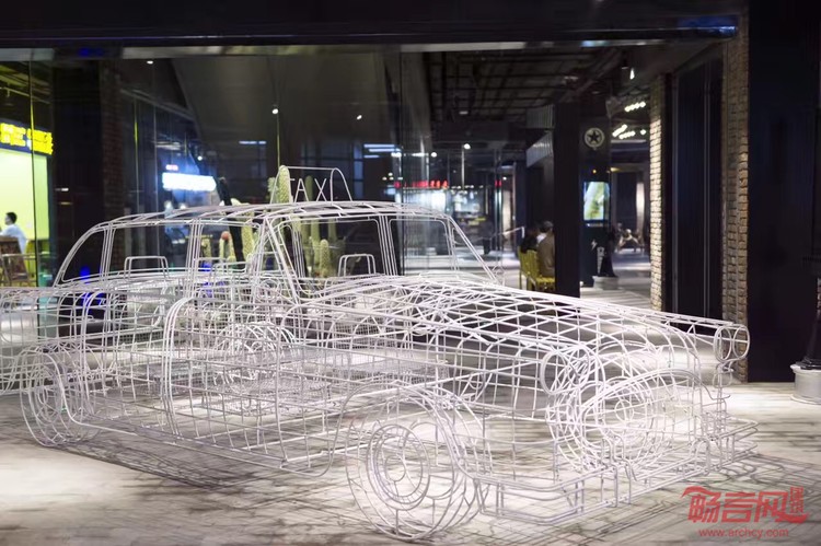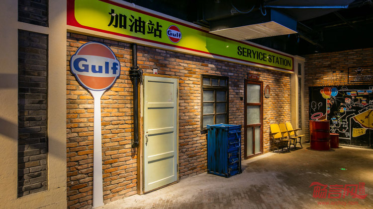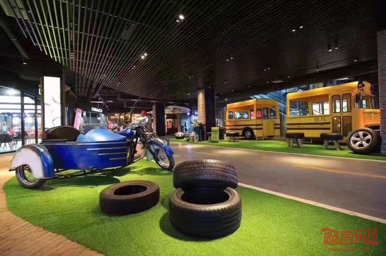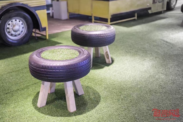 由废旧大卡车改装的冷饮吧,随处停放的复古车小品,为来往的人群提供最佳休憩场所。轮胎吧主题区少不了的是轮胎,天花处悬挂的大小各异的自行车轮,汽车轮胎组合而成的各种造型的餐桌与座椅,打破思维定势,化废为宝,物尽其用。