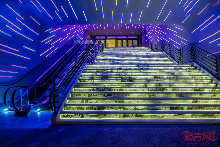 渐变的蓝与白组合而成的条形灯带,将密闭的上升空间营造成通体的蓝,充满了未来感;时而又变换成满室的昏黄,叫人沉浸在回忆的温暖里。从过去到现在,长春发展的剪影,展示在阶梯的一侧,伴随人们的脚步渐行渐远。