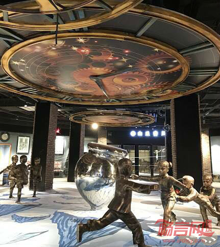返老还童主题区,一个巨大的时钟表盘,按逆时针方向运转,抽象的转轮仿佛能逆转时空。“旋转”的巨大陀螺,儿童嬉戏雕塑群,将人们瞬间带回纯真的童年时代,时间逆流,青春不改。