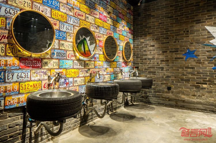 男卫生间以汽车主题为中心,装饰车行线的水泥自流平地面一直延伸到墙面,再辅以喷绘涂鸦,极富立体感。灰色砖墙上的多品类车牌,类道路反光镜的镜面,轮胎造型洗手台,黑色金属网格,一种放纵不羁的颓废感,尽显酷炫潮流。