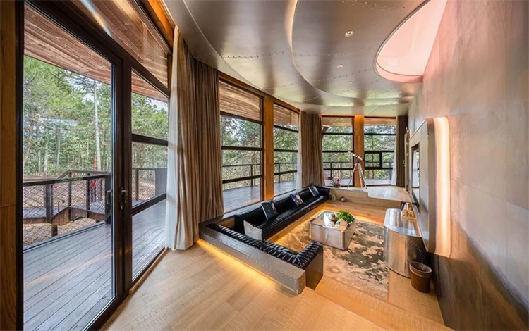 设计采用了大角度落地玻璃窗,以期对绝美景观资源的最大反馈。亲子房的定位,要求建筑形式语言须与孩子的兴趣爱好相结合。两种因素的作用下,建筑师采用了飞碟——这个儿童普遍喜欢的科幻主题。由于当地为多雨气候,气象记录显示平均每年下雨的日子近200天,建筑师在平面闭合落地玻璃带外面加入一圈围廊,加深出檐,制造出一个徐徐向室内过度的灰空间,并且在面朝齐云山主峰方向加大廊道,变成休闲平台。入住者可以在此欣赏美景,抛掷时光。
