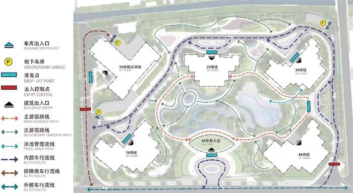 尊享归家体验:在住区入口广场设置集中大堂,给人仪式感的归家感受;内部车行流线在住宅外围环绕,既保证人车分流,又提供地面落客入户的体验。