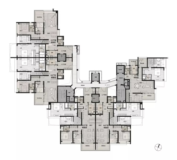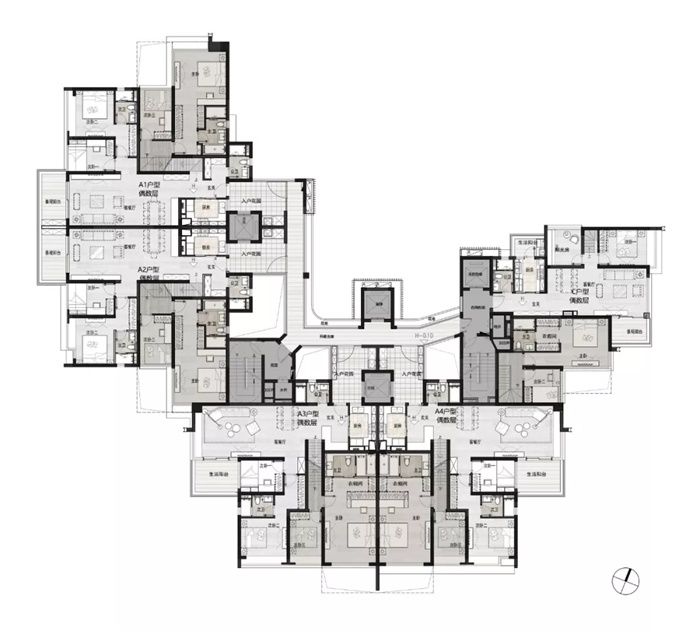 高层院落生态住宅的特点在平面设计中充分体现。以开放式核心筒改善住宅微气候,同时避免纯北向户型的出现;以空中花园和连廊作为共享交往空间。项目定位较高,基本达到一梯一户的梯户比,将电梯分散布置,让住户享有独立入户的私家体验。从电梯出来是私家入户花园,朝北望,中轴线壮丽景观尽收眼底。