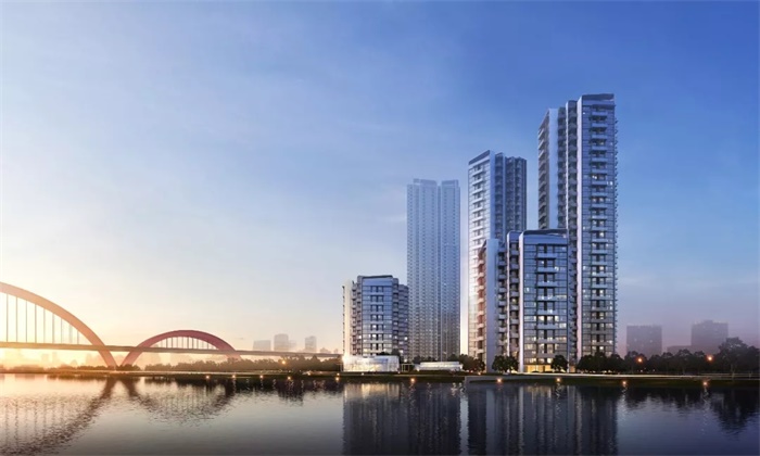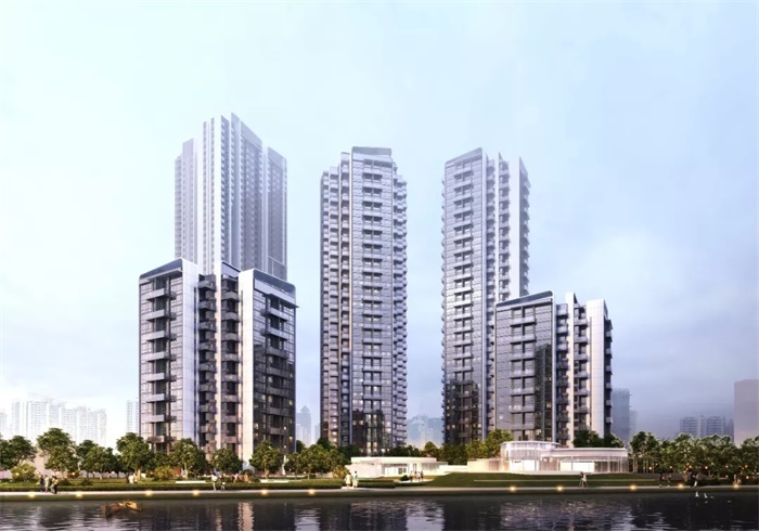 项目打破传统住宅的形象,打造可持续发展的生态住宅社区,亲近自然,提升住宅品质的同时,有助于构筑绿色生态城市界面。建筑外立面简洁大气、通透玻璃面强调公建化立面,不与江景、公共绿地冲突,共同打造一体的江畔景观形象。