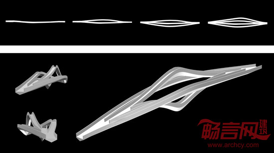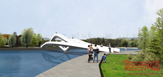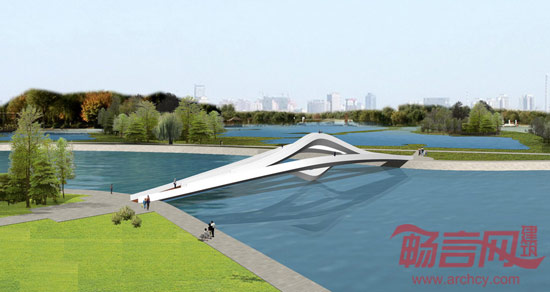 通过一座桥分化为四座桥(或许可以更多),四座桥的形态各异;同时四座桥又共为一座桥,连接东西。整体形态如同瞬间凝固在水上的雕塑,成为公园中的景观。