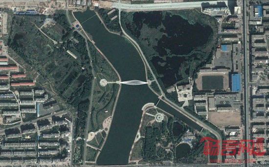 这座桥处在伊通河沿岸湿地公园当中,是一座步行桥。作为跨越水面连接湿地公园东西的通道之外,它的景观性非常重要,在湿地公园内部的休憩的人会使用观赏它,而北侧城市街道的路人也会注意到这座桥。